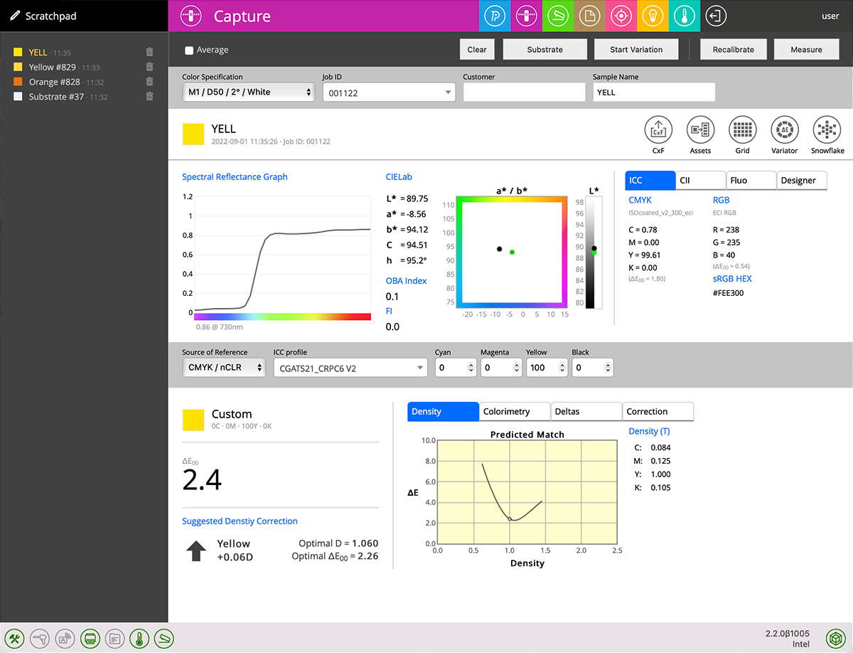 2. Measure physical color, save as reference and then compare future renditions of this color against reference to prove color matching. Print QC Label to document match.3. Measure a print and quickly compare to the desired Lab value and know if it is in tolerance. Print QC Label.4. Use Variation tool to understand the variation in the print, or graphic to ensure quality is met.5. Quickly build references (for either Color Inspector or Print Inspector) to use for future reprints of the given job.6. Different dashboard designs depending upon the users skill and knowledge level (coming soon) |