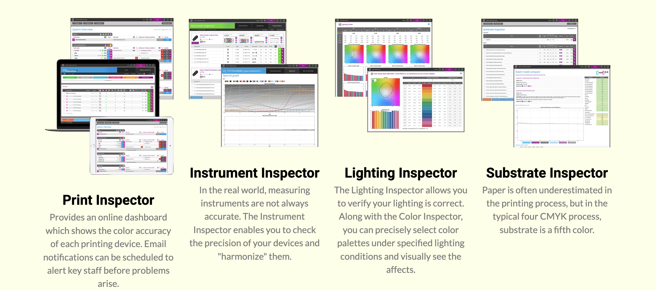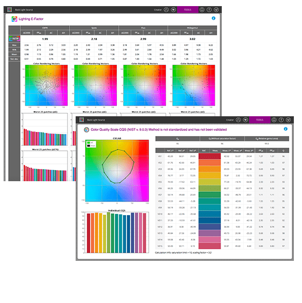 Provides information and reports to ensure plants/manufacturers are in color compliance. Real-tie information accessible via web browser, iPad or iPhone app, or scheduled via email. All international standards and regional specifications are provided for comparison. Custom references/targets and tolerance sets can be easily created to compare devices to OK sheet or baseline.