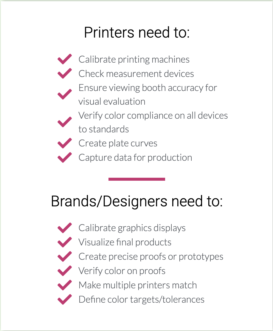 The ChromaChecker Color Conformance Platform delivers the complete platform and applications required for accurate color reproduction. From lighting, instrumentation, and substrates, to actual devices and user performance, you can track the quality of color in every step of the process.