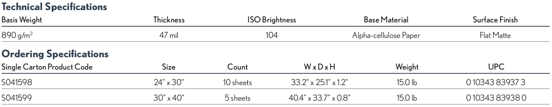 For photographers seeking a flat matte surface with the stiffness of a mounted product, Epson Enhanced Matte Posterboard is the ideal choice. This bright white posterboard is perfect for short term signage and display. It yields highly saturated images, while maintaining excellent highlight and shadow detail. Designed primarily for use with Epson UltraChrome„¢ and Archival„¢ Inks, this versatile posterboard can also be used with dye-based inks. Hobbyists, professional photographers and digital artists alike will find Epson Enhanced Matte Paper a remarkable solution for any project.