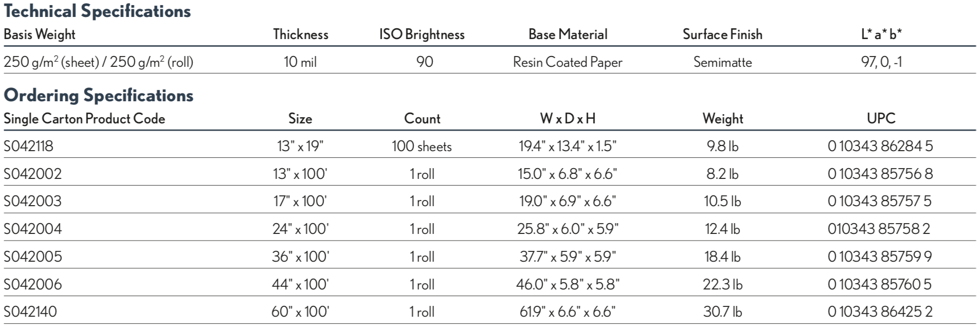Designed with 10 mil naturally bright white base, Epson Proofing Paper White Semimatte is free of optical brighteners and ideally suited for proofing a wide variety of color critical commercial offset printing applications most commonly used in high-end sheet-fed printed products such as brochures, collateral, book covers and posters. Coated with exacting standards, Proofing Paper White Semimatte is specifically optimized for proofing applications using Epson UltraChrome K3 ink and displays outstanding short term stability. Its weight, base tint, and wide color gamut makes this the perfect choice for commercial proofing applications.